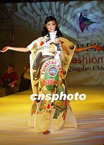 日本時裝設(shè)計師古川云雪九月周末在青島國際時裝周上,展示以鳥類與青島啤酒罐為圖案的作品,獨具匠心。 作者:毛建軍