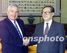 中國國家主席江澤民二十七日在北京會見美國IBM公司董事長郭士納。作者:滿會喬