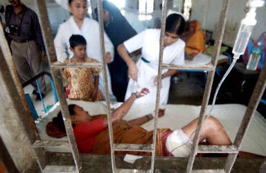 孟加拉警方稱,該國西部28日晚發(fā)生兩起炸彈爆炸事件,造成至少3人喪生,100多人受傷。圖為受傷人員在醫(yī)院進行搶救。