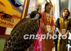 一只卡塔爾蒙面金雕在十月的釜山亞運會新聞中心里,為下屆亞運會在多哈舉行身為吉祥物公關(guān)。作者:賈國榮