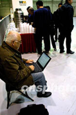 22日,一名美國記者在芝加哥奧黑爾機(jī)場(chǎng)休息室里,搶發(fā)中國國家主席江澤民訪問美國飛抵芝加哥的現(xiàn)場(chǎng)新聞。作者:王瑤