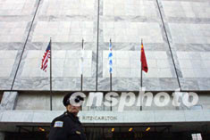 22日,一名芝加哥女警員在市中心里茲酒店前執(zhí)行任務(wù),確保剛剛到訪的中國國家主席江澤民一行訪問順利。作者:王瑤