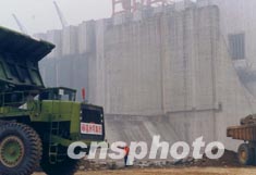 江水奔騰,浪花飛卷。導流明渠右岸數(shù)百臺大型運載車,不斷地將一車車石料傾人江中。