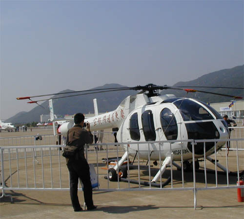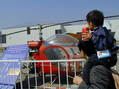 前來(lái)參觀航展的父子倆,駐足于一架超輕型直升機(jī)