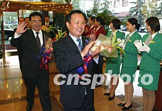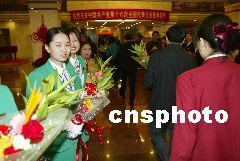出席中國(guó)共產(chǎn)黨第十六次全國(guó)代表大會(huì)的代表五日開(kāi)始陸續(xù)抵京。圖為工作人員手持鮮花在代表下榻的酒店熱情迎接 毛建軍 攝