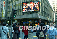 中共十六大11月8日在北京開幕,香港有線電視臺全程直播。中共中央總書記江澤民作報(bào)告時,正值香港金融心臟中環(huán)一帶緊張的上班時間,但仍然有不少市民駐足觀看。任晨鳴 攝