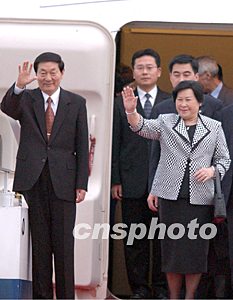 中國(guó)國(guó)務(wù)院總理朱镕基和夫人勞安,11月18日下午乘坐專機(jī)抵達(dá)香港參加“第十六屆世界會(huì)計(jì)師大會(huì)”。中新社傳真 任晨鳴 攝