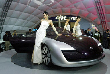 11月20日,韓國模特在漢城展示高科技智能雙門小轎車。