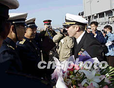 24日上午10時許,美國海軍“福斯特”號在艦長約翰·尼高中校的率領(lǐng)下,徐徐駛?cè)肭鄭u港,開始對青島進(jìn)行為期5天的友好訪問。隨艦來訪官兵共353人,其中軍官26人,水兵327人。圖為北海艦隊(duì)官兵迎接福斯特號艦長。作者:王松岐