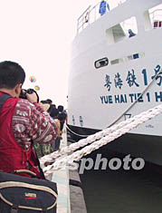 昨日清晨7時許,記者趕往?诘幕疖嚩奢喆a頭時,見到碼頭周圍彩旗飛揚,人聲鼎沸,場面熱鬧非凡,碼頭的周圍早已擠滿了爭睹渡輪芳容的人們。?诘拿耖g藝人自發(fā)組成演奏樂隊,到為輪船廠進港助威,有些市民也自發(fā)準備了鞭炮等為渡輪進港助興。據(jù)有關(guān)人士介紹,當天趕到現(xiàn)場觀看火車渡輪進港的,達到2000人之多,他們當中有當?shù)氐氖忻,也有來海南旅游的客人。在碼頭上,一對操著廣東口音的老人引起了記者的注意。據(jù)他介紹,他是廣東臺山人,初中剛畢業(yè)他就跟隨著建設(shè)海南的大軍南下,自上世紀80年代以后,家中的老父年邁多病,他幾乎每年都要回兩次家。由于收入微薄,坐不起飛機,每次只能是坐汽車,車從?诘男赂鄞a頭上船,到海安就要一到兩個小時,尤其是他暈船,一路的搖晃顛簸,不斷的嘔吐讓他痛苦不已,1992年老父過世后,他也因為怕坐船再也沒有回去過。聽說今年年底火車渡輪將開通,坐上平穩(wěn)的火車就可到達廣東各地,他便跟老伴商量趁還能走得動時多回老家看看。今天天還沒亮,他就拖著老伴走了近一個小時的路程趕來碼頭看這艘中國第一的火車渡輪。
