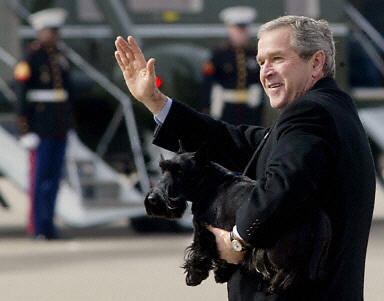 11月27日,美國總統(tǒng)布什懷抱小狗,回得克薩斯州克勞福德牧場過感恩節(jié)。