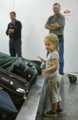 一個逃過一劫的三歲女孩在等待她的行李
