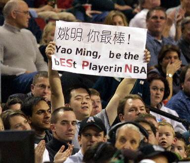 11月29日,在NBA常規(guī)賽火箭隊與超音速隊的比賽中,火箭隊客場以83:72戰(zhàn)勝超音速隊,F(xiàn)場觀眾為姚明助威,打出“姚明你最棒!”的橫幅。