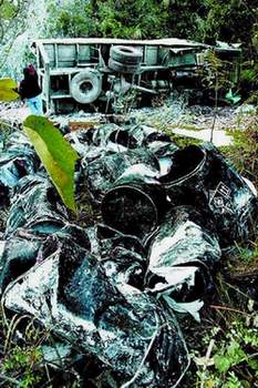 前天1時50分,一輛車牌號為桂GA1416的解放牌平頭大貨車在金秀瑤族自治縣七建鄉(xiāng)至三角鄉(xiāng)途中翻下約60米高的山坡,滑下金秀河道。車上載著的100桶共20噸三氧化二砷(俗稱砒霜),有33桶跌入河道,其中30桶不同程度破損,少量砒霜散落河水中,其余67桶翻在山坡上。目前,此事已經(jīng)上報(bào)中央和國務(wù)院,中央政治局常委、國務(wù)院副總理吳邦國要求迅速妥善處理好此事。