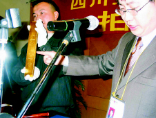 今天上午9點(diǎn),距離正式開拍還有一個(gè)小時(shí),設(shè)在成都人和賓館會(huì)議室里的拍賣現(xiàn)場已是人聲鼎沸,從全國各地趕來的多家媒體紛紛搶占有利地形,而“競拍席”上的買家則在最后時(shí)刻才神秘亮相。此前記者獲知,組織此次拍賣的四川金通拍賣行一直對參與競拍的三家企業(yè)避而不談,只透露其中有著名電器銷售公司成都國美電器,而另兩家則是四川本省的企業(yè),但是在競拍現(xiàn)場記者注意到,只有代表成都國美電器的28號(hào)競買者比較活躍,而另外兩家企業(yè)的競買人卻出人意料地沒有舉牌參加競買,結(jié)果,在開場20分鐘后兩塊金錠就毫無懸念的以底價(jià)62萬元被拍出。