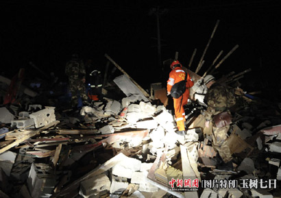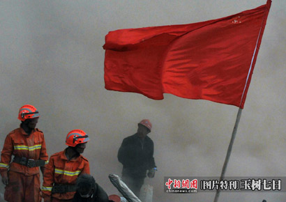 20日各地救援隊在結(jié)古鎮(zhèn)災區(qū)煙塵中堅持抗震救災