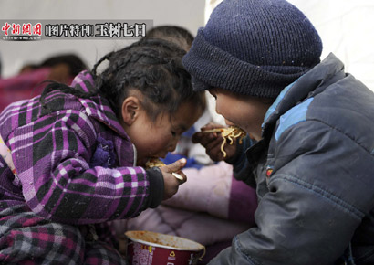 災民安置點內(nèi)兩名受災孩童分食一盒方便面