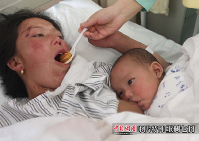 護士正在給傷員喂飯,懷中4個月大的孩子在吃奶