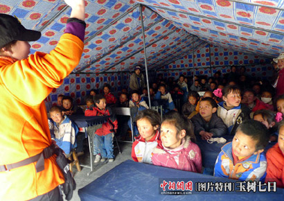 青海玉樹縣第三完全小學的帳篷學堂里學生們正在上課
