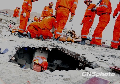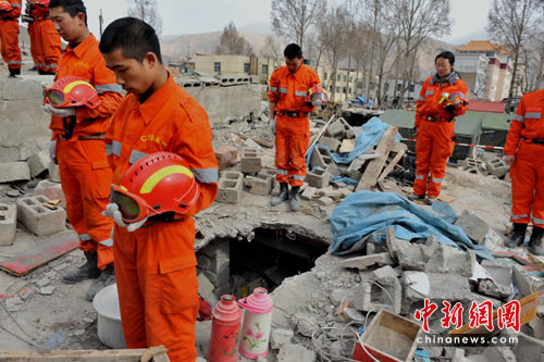 地震救援隊在玉樹地震災(zāi)區(qū)廢墟上默哀