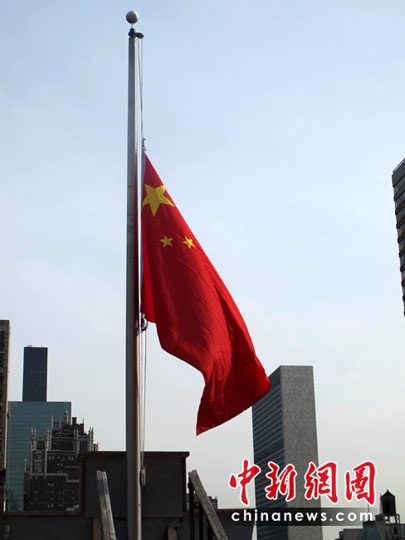 中國常駐聯(lián)合國代表團下半旗為地震遇難同胞致哀