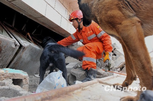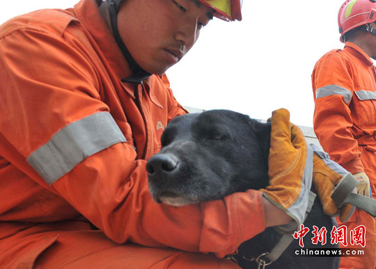 圖:搜救犬黑貝玉樹地震廢墟上的一個清晨