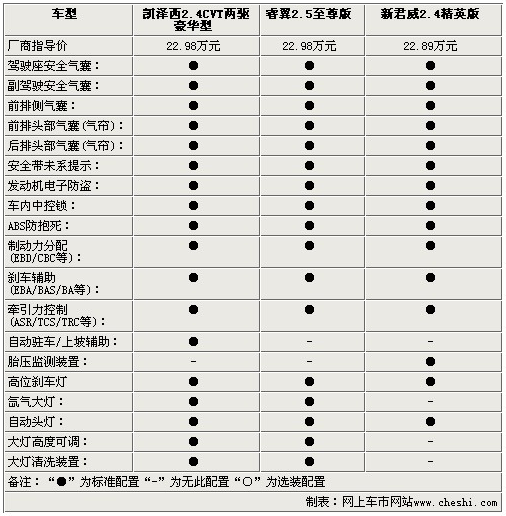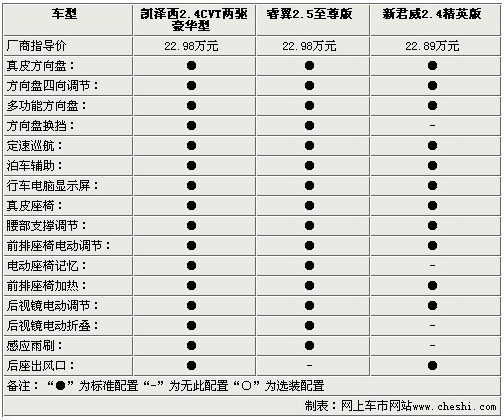 進(jìn)口鈴木凱澤西于7月2日正式上市銷(xiāo)售,本次上市的凱澤西共推出6款新車(chē),售價(jià)區(qū)間18.98-27.48萬(wàn)元。凱澤西是鈴木汽車(chē)旗下的旗艦運(yùn)動(dòng)型轎車(chē),以上市后的報(bào)價(jià)來(lái)看,這個(gè)價(jià)格區(qū)間將對(duì)一些同價(jià)位的車(chē)型造成不小的影響。雖然同為20萬(wàn)左右,但是純進(jìn)口車(chē)型相比國(guó)產(chǎn)車(chē)型還是有一定優(yōu)勢(shì)的。今天我們從凱澤西、馬自達(dá)6睿翼和新君威當(dāng)中挑選出三款款價(jià)格十分接近的車(chē)型,凱澤西2.4L兩驅(qū)豪華版、睿翼2.5L至尊版和新君威2.4L精英型,售價(jià)同為22.98萬(wàn)左右的它們,在配置方面如何呢?接下來(lái)為您揭曉。