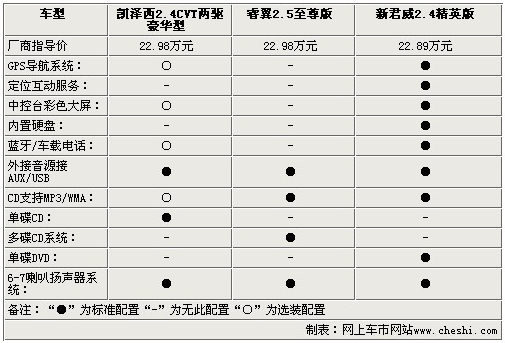 影音系統(tǒng)方面,三款車(chē)都為使用者提供了多揚(yáng)聲器的配置,除了AUX/USB接口外,凱澤西還配備了單碟CD,而睿翼則配備了更為便利的6碟CD系統(tǒng),新君威為單碟DVD。通過(guò)以上參數(shù)配置方面的比較,對(duì)于三款22.98萬(wàn)左右的中級(jí)車(chē),配置方面基本打成平手,僅在一些細(xì)節(jié)方面有所出入,不過(guò)動(dòng)力方面凱澤西確是實(shí)實(shí)在在的戰(zhàn)勝了睿翼和新君威,幾乎將2.4L引擎的動(dòng)力發(fā)揮到了極致。