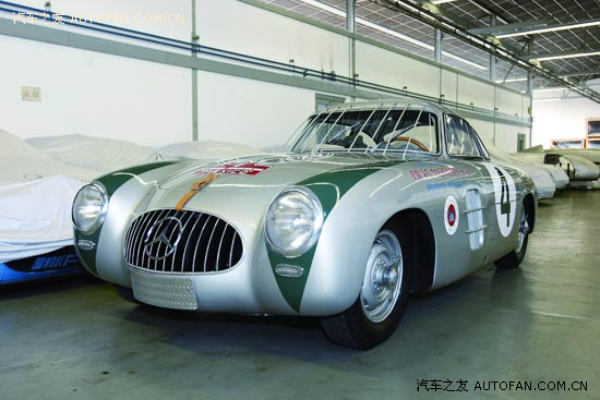 這輛前風(fēng)擋安有柵欄的300SL,參加過50年代1600公里不停歇的泛美拉力賽,柵欄是為了阻擋老鷹裝碎風(fēng)擋。它出門參展的時候,保險額度達到300萬歐元。全球目前共有5輛,3輛在這個倉庫里。