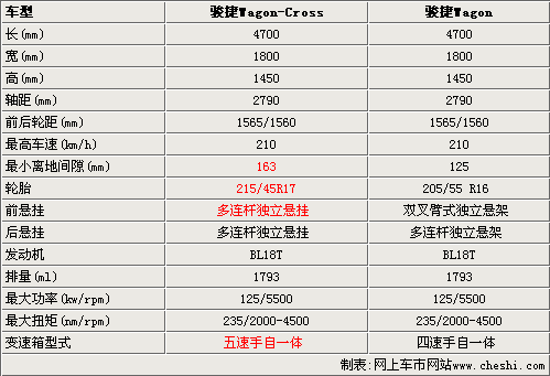 新駿捷WagonCross與駿捷Wagon的車身尺寸基本沒(méi)有變化,長(zhǎng)寬高分別是4700/1800/1450毫米,軸距和前后輪距也沒(méi)有變化。但新駿捷WagonCross加大了離地間隙,達(dá)到了163毫米。另外,新駿捷WagonCross配備的是17英寸輪胎,而駿捷Wagon則配備16英寸輪胎。新駿捷WagonCross采用前后多連桿式設(shè)計(jì),駿捷Wagon則采用雙叉臂式獨(dú)立懸架。在動(dòng)力方面,這兩款車并沒(méi)有太大差別,只不過(guò)新駿捷WagonCross采用五速手自一體變速器,比老款駿捷Wagon有很大提高。