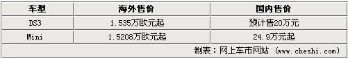 而在目前雪鐵龍DS系列車型僅有DS3一款,不出意外的話它將是長安-標(biāo)致雪鐵龍推出的首款車型,預(yù)計(jì)將在2012年投產(chǎn)。DS3是一款雙門運(yùn)動型小車,競爭對手則是Mini,在歐洲地區(qū)的售價(jià)1.5萬歐元起。Mini在國內(nèi)的售價(jià)為24.9萬元起(海外售價(jià)同樣是1.5萬歐元起),考慮到DS3國產(chǎn)的原因,它的售價(jià)很可能會在20萬元左右,比Mini要便宜一些。而在國產(chǎn)前,這款車也在4月的北京車展上亮相過,看來是早有國產(chǎn)準(zhǔn)備。