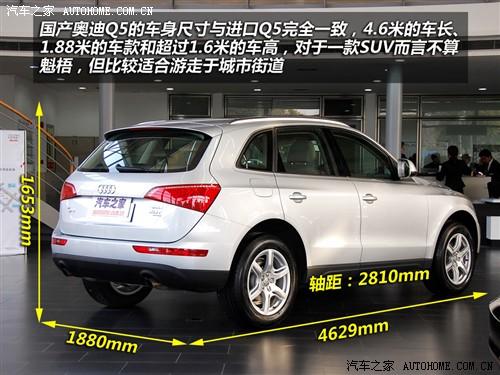 國產(chǎn)Q5的車身尺寸與進口Q5完全一樣,長×寬×高分別為4629×1880×1653mm,軸距為2807mm。與其同級對手如寶馬X3、奔馳GLK、沃爾沃XC60等車型尺寸接近。車內(nèi)空間算是比較寬敞了。輪轂尺寸與進口版相比則明顯縮水,四款車型的輪轂依次分別為17、18和19寸,而進口版卻是全系標配了20寸的輪轂。