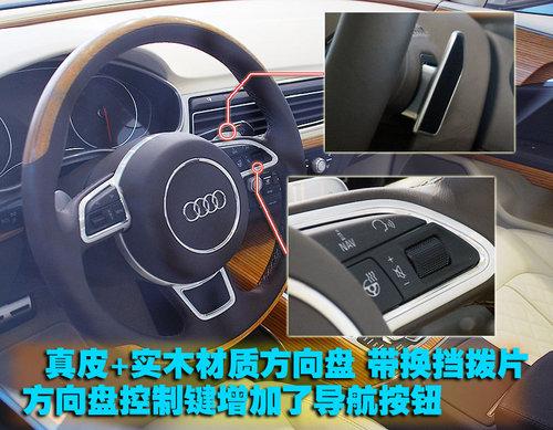 方向盤部分能夠看到奧迪專為跑車化而設(shè)計的三幅運動型方向盤,通常A8的方向盤是更加舒適化的4幅方向盤。真皮縫制與實木材料的應(yīng)用是奧迪為豪華車市場專門打造的。在這里我們發(fā)現(xiàn)了以前奧迪并未在方向盤上安裝的“Nav”即導(dǎo)航按鈕。