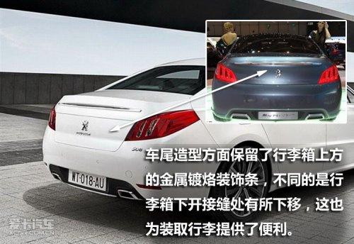 與概念車5 by Peugeot相比,車尾造型方面保留了行李箱上方的金屬鍍烙裝飾條,不同的是行李箱下開接縫處有所下移,這也為裝取行李提供了便利。左右雙開的排氣造型與5 by Peugeot保持一致。另外,原來LED和車體鑲嵌的背對雙C造型有所改變,變?yōu)榱烁咨a(chǎn)安裝的整體組合式設計,不過在燈體內(nèi)部的點亮部分會繼續(xù)保留概念車上的設計元素。