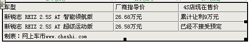 | 新銳志 REIZ 2.5S AT/MT特別導航版 | 24.58萬 | 21.08萬 | 3.5萬 | 有現(xiàn)車5種顏色全 |