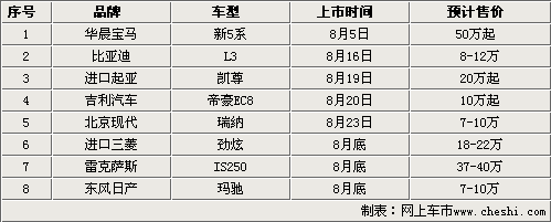 時間進入到8月份以后,我國絕大部分城市都已經(jīng)進入到了真正的夏天,伴隨著酷熱的天氣各大汽車廠商也紛紛選擇了盛夏時節(jié),發(fā)布他們自己的最新產(chǎn)品。據(jù)記者統(tǒng)計,在2010年8月份里來自國產(chǎn)和進口各類新車達到了8款之多,平均每周就有就有2款新車與我們見面。對于要即將上市的新車,消費者的關注度自然是很高的,下面就讓我們提前去看看。