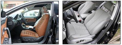 座椅方面同樣體現(xiàn)出了兩款車型不同的設(shè)計(jì)理念,CC豪華版的棕色波浪式座椅,看起來(lái)包裹性出色,側(cè)向給予的支持力也還算到位,如果您另對(duì)黑色座椅鐘愛尤佳,那么選裝Alcantara材質(zhì)拼裝的翻毛真皮座椅一定會(huì)是個(gè)更好的選擇。邁騰淺色的內(nèi)飾看起來(lái)更加厚重,偏向家用風(fēng)格,坐上去感覺包裹性一般,但真皮座椅質(zhì)地還算比較不錯(cuò)。