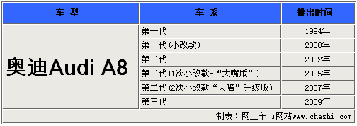 Audi A8是奧迪汽車的豪華旗艦車型,與其競爭對手梅賽德斯-奔馳S級以及寶馬7系相比,奧迪A8還很“年輕”。說起A8的歷史,自1994年推出至今僅有十余年,但不得不承認的是奧迪A8成長的很快,從低調(diào)到張揚大膽的創(chuàng)新設(shè)計引領(lǐng)了豪華轎車的發(fā)展方向。下面我們就一同來了解下這款“年輕”旗艦車型的歷史。