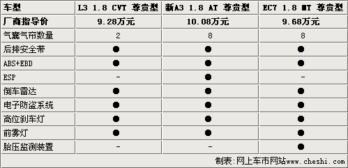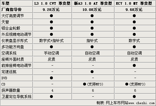 奇瑞新A3和帝豪EC7都采用自動(dòng)空調(diào),而比亞迪L3卻依然采用手動(dòng)機(jī)械式空調(diào),相對(duì)而言有些落伍。奇瑞新A3雖然配備了定速巡航系統(tǒng),在高速駕駛中可以帶來更多的舒適性,但個(gè)人認(rèn)為也帶來一定的安全隱患。比亞迪L3配備了DVD系統(tǒng),和帝豪EC7一樣都配備了GPS導(dǎo)航功能。奇瑞新A3配備支持MP3、WMA音頻格式的CD音響,與帝豪EC7一樣都配備6聲道音響系統(tǒng),比比亞迪L3的音響效果應(yīng)該更出色。