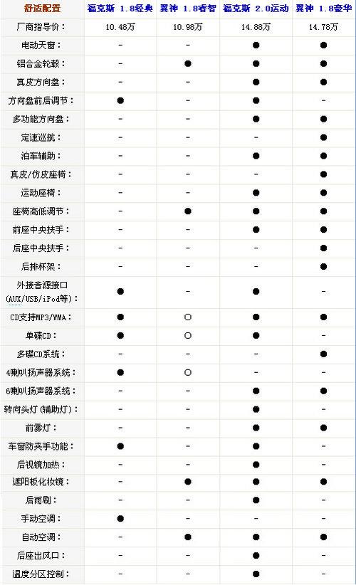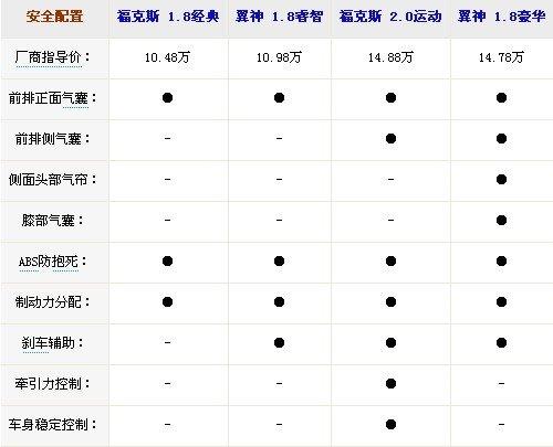 在安全配置方面,兩車的入門版車型基本保持在同一水平,正副駕駛雙安全氣囊和ABS+EBD也是目前主流的入門車型安全配置。而在較高配車型上,福克斯在主動安全上有一定優(yōu)勢,其運動版車型擁有牽引力控制和電子穩(wěn)定程序。翼神則在被動安全性上出色一些,側(cè)面頭部氣簾僅出現(xiàn)在?怂谷龓廊A型上,而全系標(biāo)配的膝部氣囊在?怂沟娜刀紱]有配備。