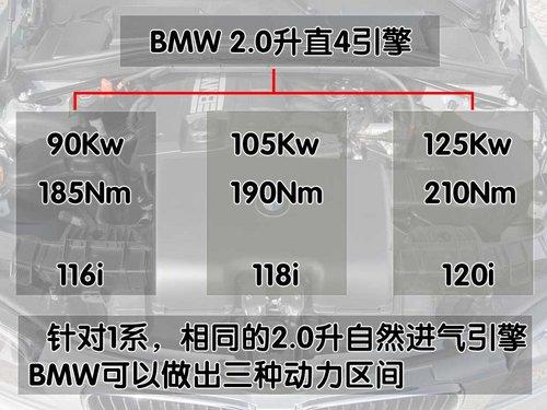 在歐洲市場(chǎng)BMW旗下的1系轎車在2.0升排量這個(gè)級(jí)別內(nèi),擁有3款細(xì)分車型,分別是116、118和120。而其他排量的車型還包括130以及120的柴油車款,目前中國(guó)市場(chǎng)所銷售的1系為120和130兩個(gè)款式。很難想象一款2.0升級(jí)別的自然進(jìn)氣引擎被BMW弄出了那么多種“花樣”,在歐洲市場(chǎng)就有從90千瓦/185牛米、105千瓦/190牛米到125千瓦210牛米的3種車款。其中90千瓦/185牛米的入門車款被命名為116i屬于BMW 1系當(dāng)中價(jià)位最低的車款。