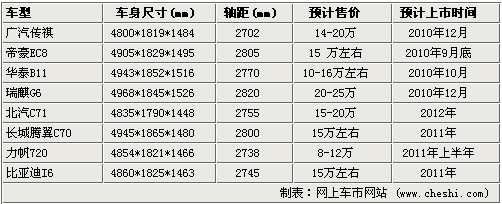 從上表可以看到,這八款新車型瑞麒G6的尺寸最大,車長2968mm、軸距達2820mm,其次是長城騰翼C70,而最先推向市場的很可能是帝豪EC8,預(yù)計售價15萬左右,搭載2.0L和2.4L發(fā)動機。剛剛下線的傳祺將于廣州車展上市,預(yù)計售價14-20萬元之間。