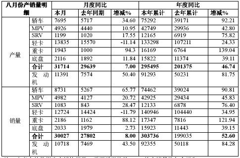 江淮汽車(chē)9月6日晚間發(fā)布2010年8月份產(chǎn)銷(xiāo)快報(bào),公司8月份總產(chǎn)量為3.17萬(wàn)臺(tái),同比增長(zhǎng)7%;總銷(xiāo)量為3萬(wàn)臺(tái),同比增長(zhǎng)8%。公司1-8月累計(jì)總產(chǎn)量為29.54萬(wàn)臺(tái),同比增長(zhǎng)46.73%,總銷(xiāo)量為30.37萬(wàn)臺(tái),同比增長(zhǎng)52.6%。