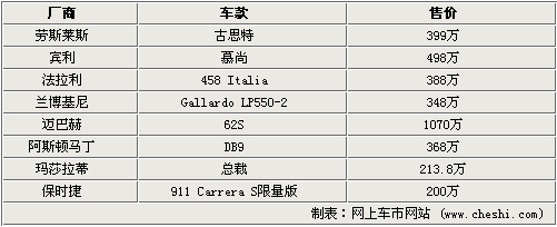 這次成都車(chē)展勞斯萊斯、賓利、法拉利、蘭博基尼等高端品牌悉數(shù)參展,為成都的消費(fèi)者帶來(lái)了其當(dāng)家車(chē)款,比如古思特、慕尚、458 Italia、Gallardo LP550-2都是上市不久的新車(chē),邁巴赫在車(chē)展上首發(fā)了其全新一代62S,預(yù)計(jì)售價(jià)1070萬(wàn)元,而保時(shí)捷也發(fā)布了911 Carrera S Porsche Carrera Cup Asia,限量發(fā)售30臺(tái)預(yù)售200萬(wàn)。