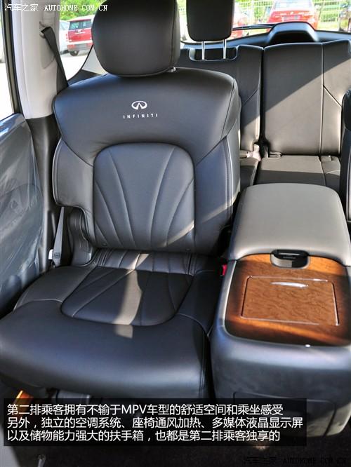 2011款英菲尼迪QX56的車身尺寸十分夸張,車長5290mm寬2030mm高1935mm,軸距達(dá)到3075mm,所以空間和舒適性絕對不是問題。即使是第二排乘客也擁有極高的乘坐感受,獨(dú)立空調(diào)、座椅通風(fēng)、中央扶手箱都是后排獨(dú)享的配置。