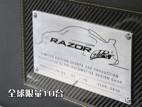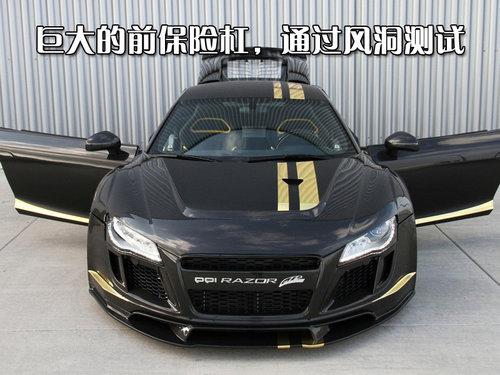 PPI打造的改裝版R8命名為RAZOR GTR-10,這個名字中的10意味只限量改裝10臺。RAZOR GTR-10是一款高性能全碳纖維輕量化超級跑車,前臉換裝了巨大的碳纖維運(yùn)動前保險杠,完美的運(yùn)用了空氣動力學(xué)并通過了風(fēng)洞測試。前備箱蓋一側(cè)有兩條金色賽道紋貫穿車身前后。