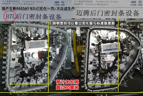 目前,加長版的PASSAT B7已經在一汽-大眾長春的第二工廠進行了試生產,在PASSAT B6(邁騰)的生產線上,我們發(fā)現(xiàn)了標有“B7L”字樣的后門密封條設備。與目前在產的標準軸距版邁騰相比,僅后門的長度就增加了10厘米左右,并且我們從工作人員那里也獲得了“B7L”是加長邁騰的肯定答案。由此可見,全新PASSAT B7加長版落戶一汽-大眾已成定局。