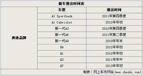 從表中可以清晰的體現(xiàn)出,奧迪品牌在未來的3年內(nèi)將推出近10款車型,其中包括品牌旗下第一款小型車A1,剛剛進(jìn)國(guó)內(nèi)A3下一大產(chǎn)品,全新新一代A6、A8,動(dòng)感跑車R4,以及SUV車型Q1、Q4以及Q7的換代車型。未來3年將推出的這些車型將為奧迪品牌的下一個(gè)“百萬輛”銷量打下堅(jiān)實(shí)基礎(chǔ)。