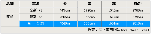 從表中可以看出,由于定位不同,全新一代X3與上市不久的X1在尺寸上擁有較大測的差距,兩者雖然是同平臺的產(chǎn)物,但完全不用擔心新X3會走緊湊級的路線。與現(xiàn)款X3相比全新一代X3整體尺寸呈現(xiàn)出很明顯的“增肥”感覺,長寬高分別提升了83mm/29mm/40mm,軸距也同時增加了15mm之多,換代以后的全新X3在空間上有了大跨步的前進。