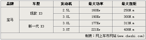 全新一代X3搭載3.0L和3.0T兩款發(fā)動機,同為直列6缸體設計。3.0L發(fā)動機經(jīng)過全新調(diào)教最大輸出功率下降至177Kw,而最大功率提升至313N.m,加速能力得到提升;3.0T發(fā)動機采用N55單渦輪雙渦管結(jié)構(gòu),最大動力輸出達到了221功率 ,峰值扭矩更是達到了驚人的408N.m,調(diào)教更加趨向于越野風格。